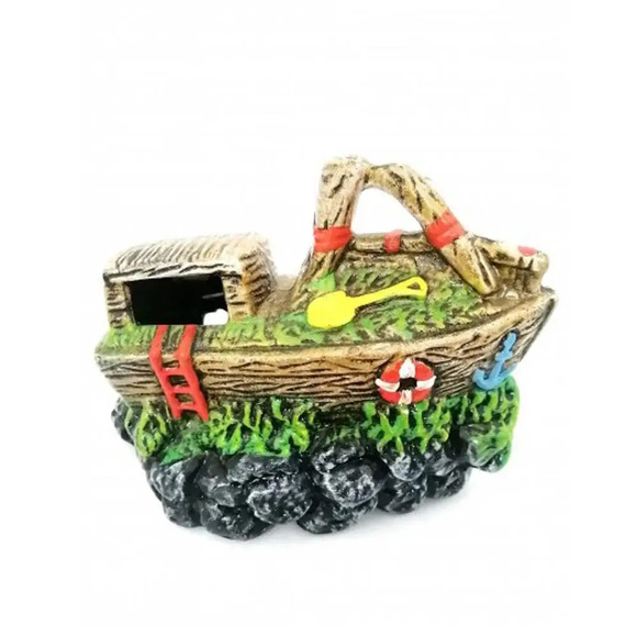 Enfeite Barco de Pesca Decorado TremaO Enfeite Barco de Pesca Decorado Trema é um produdo de resina de poliéster para uso submerso em aquários de água doce, material totalmente atóxico, pitura de alta durabilidade de compatível ao meio biológico.Seu aquário mais encantador e enriquecido de beleza, é a decoração que você estava procurando.Medidas aproximadaA: 12cm x L: 4cm x C: 14cm
